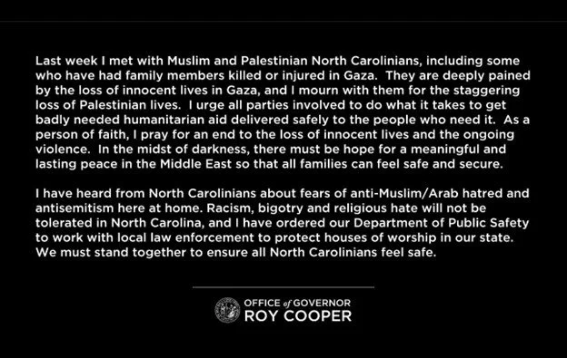 Throughout his tenure, Governor Cooper has worked to center issues important to directly impacted and marginalized communities- protecting voting rights, protecting access to reproductive rights and care, and fighting back against anti-immigrant policies. While Governor Cooper’s recent statement acknowledging loss of Palestinian lives in Gaza is important, the group continues to urge him to lean on the values of justice and compassion and call for a permanent ceasefire to ensure safety for all people.